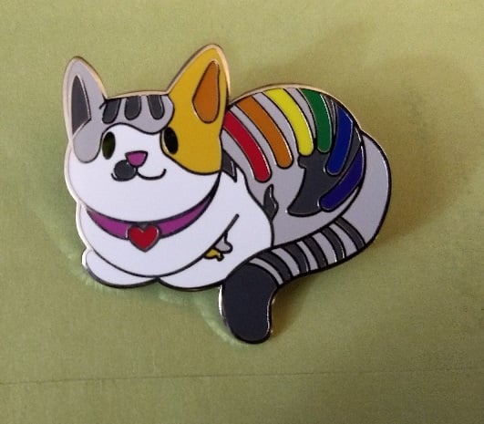 This pin is modeled after my cat Tsuki. Originally, I used this pin to raise money for The Trevor Project, but Tsuki had to go to the vet and the Emergency Animal Hospital on the week of August 29th.